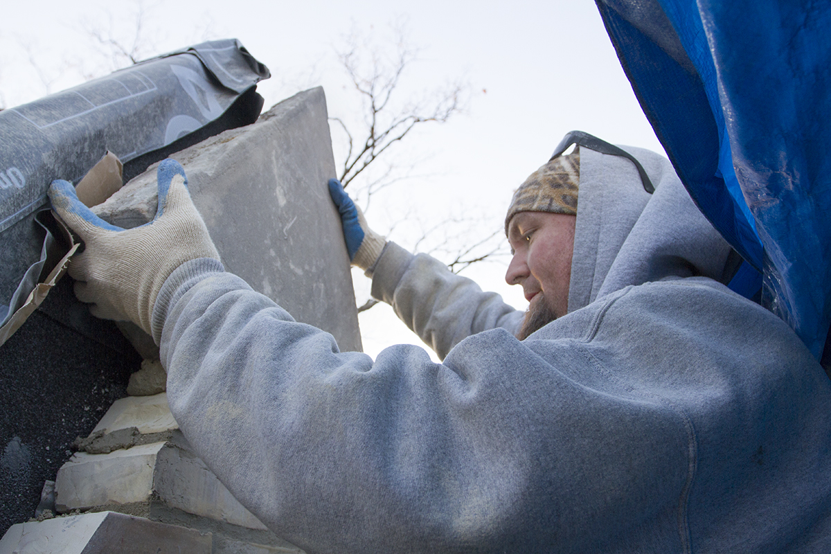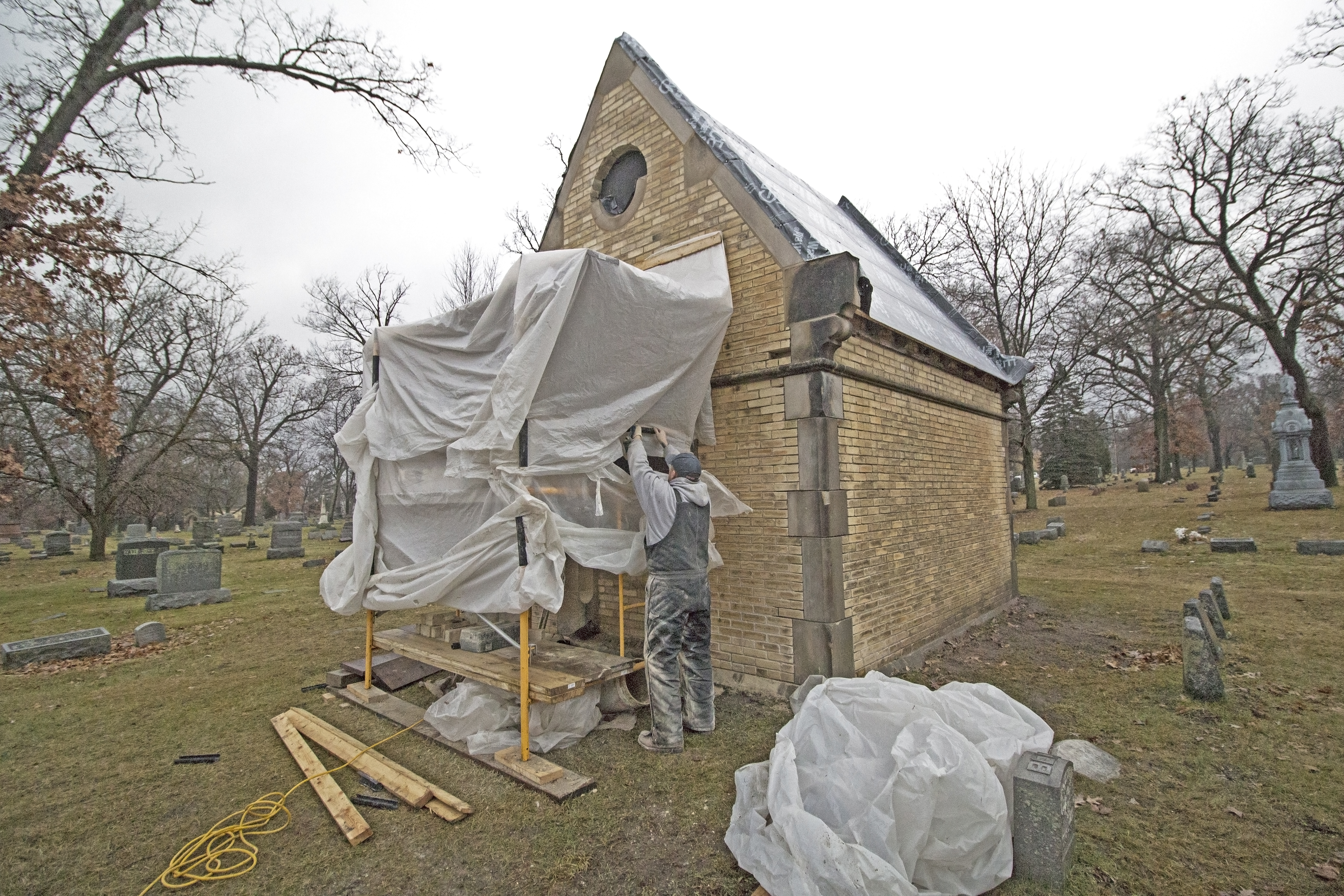Bill Milhiem of Milhiem Masonry works on the Melville Mausoleum brick in December. At top left, he adjust scaffolding tarps to protect his work from the weather. At top right, he places a salvaged stone at the peak of the north side of the structure. Below left, he bricks up the entrance to the tomb. Over the years people trying to break into the mausoleum damaged the stone around the door. Below right, Milhiem selects bricks to block the doorway. The bricks were salvaged when the mausoleum was damaged by a large branch from a nearby oak tree in 2004.